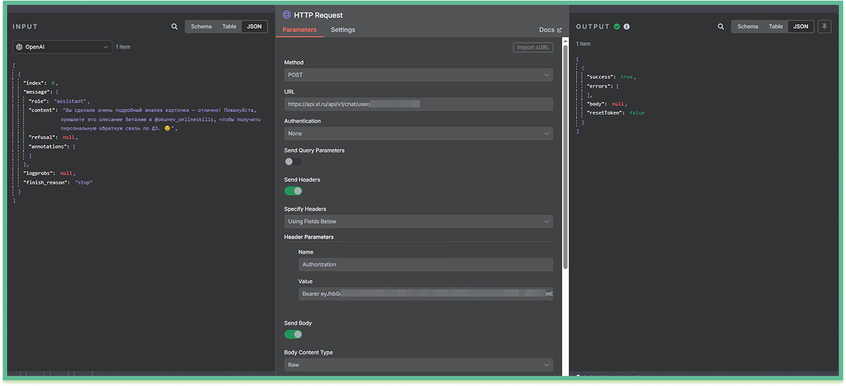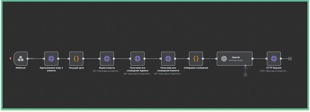 Далее n8n запускает ноду OpenAI с промтом и диалогами для контекста. OpenAI выдает ответ, и n8n запускает отправку ответа через XL по API — для сохранения этого ответа в истории XL.