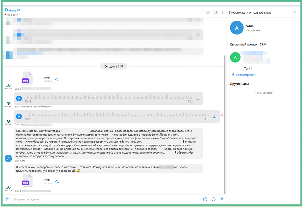 ИИ-помощник отвечает мгновенно и возвращает пользователя в нужный этап воронки — ни один клиент больше не теряется. А команда онлайн-школы видит все диалоги и может подключиться в любой момент. К переписке можно вернуться при необходимости, все данные остаются в AXL.