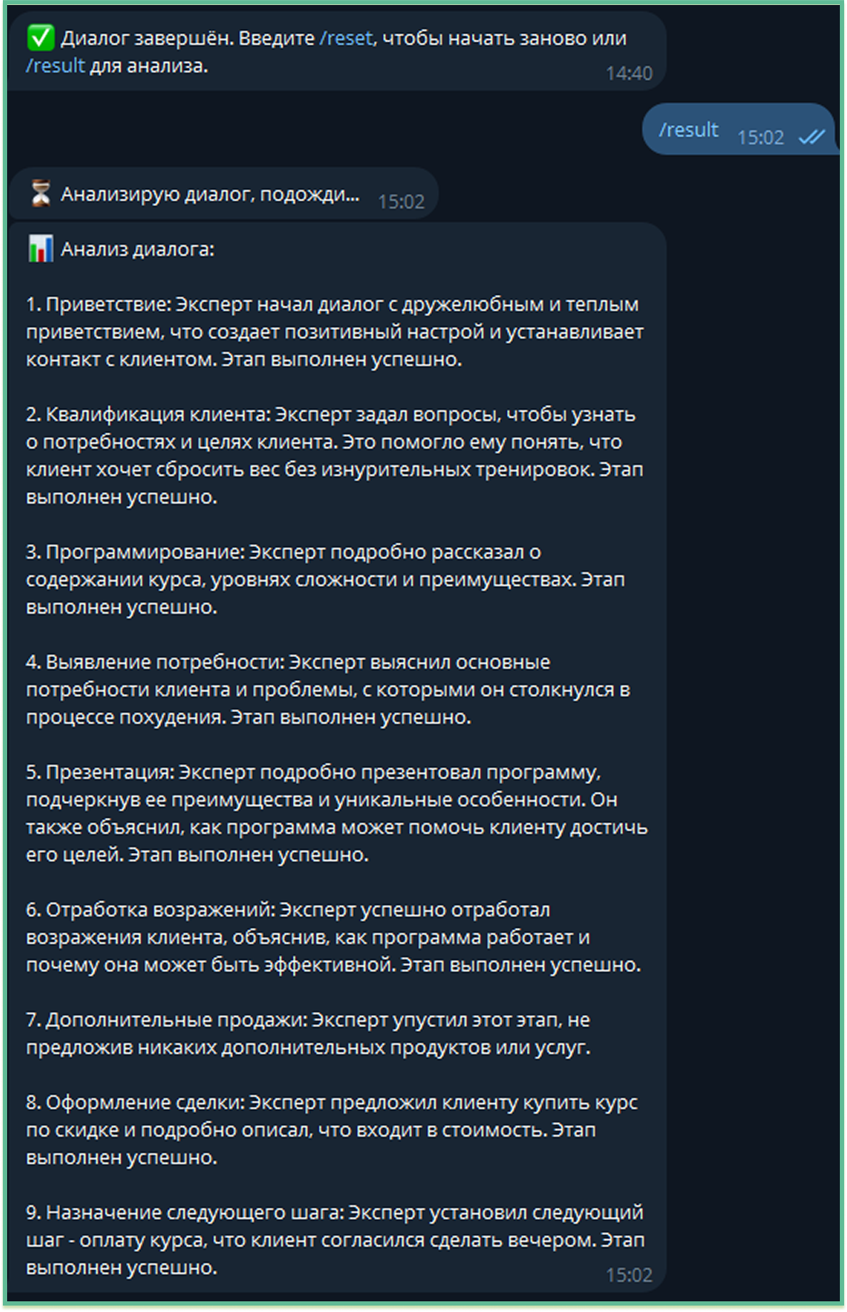 После завершения тренировки бот анализирует переписку: выявлены ли потребности, как отработаны возражения, насколько вежливый и убедительный стиль общения. Пользователь получает обратную связь в формате комментариев по каждому этапу продаж.