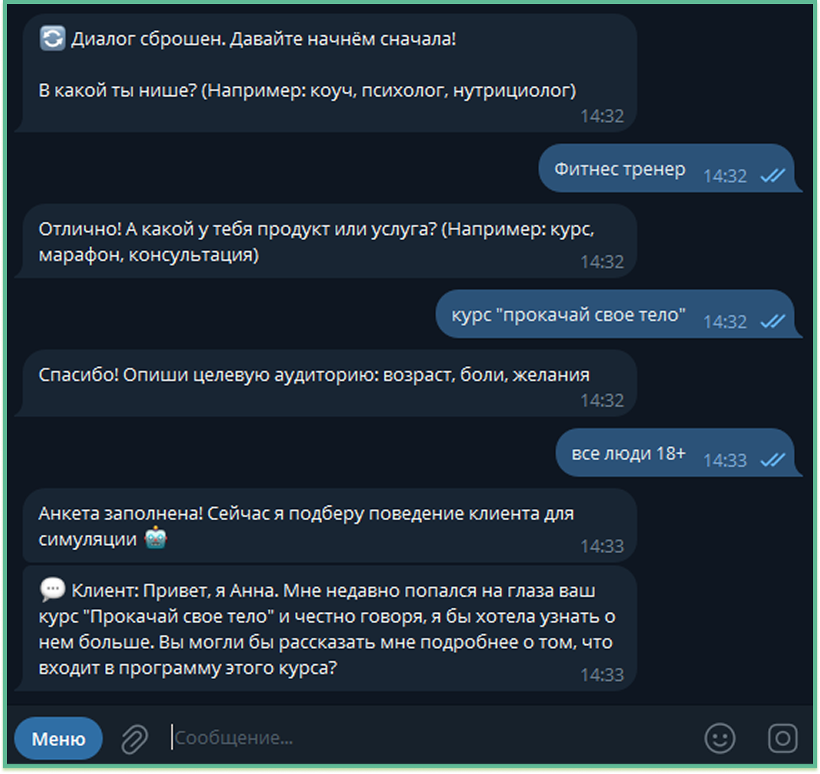 1. Настроили обработку сообщений: бот принимает сообщения менеджера, отправляет их в модель и возвращает ответы клиента.
