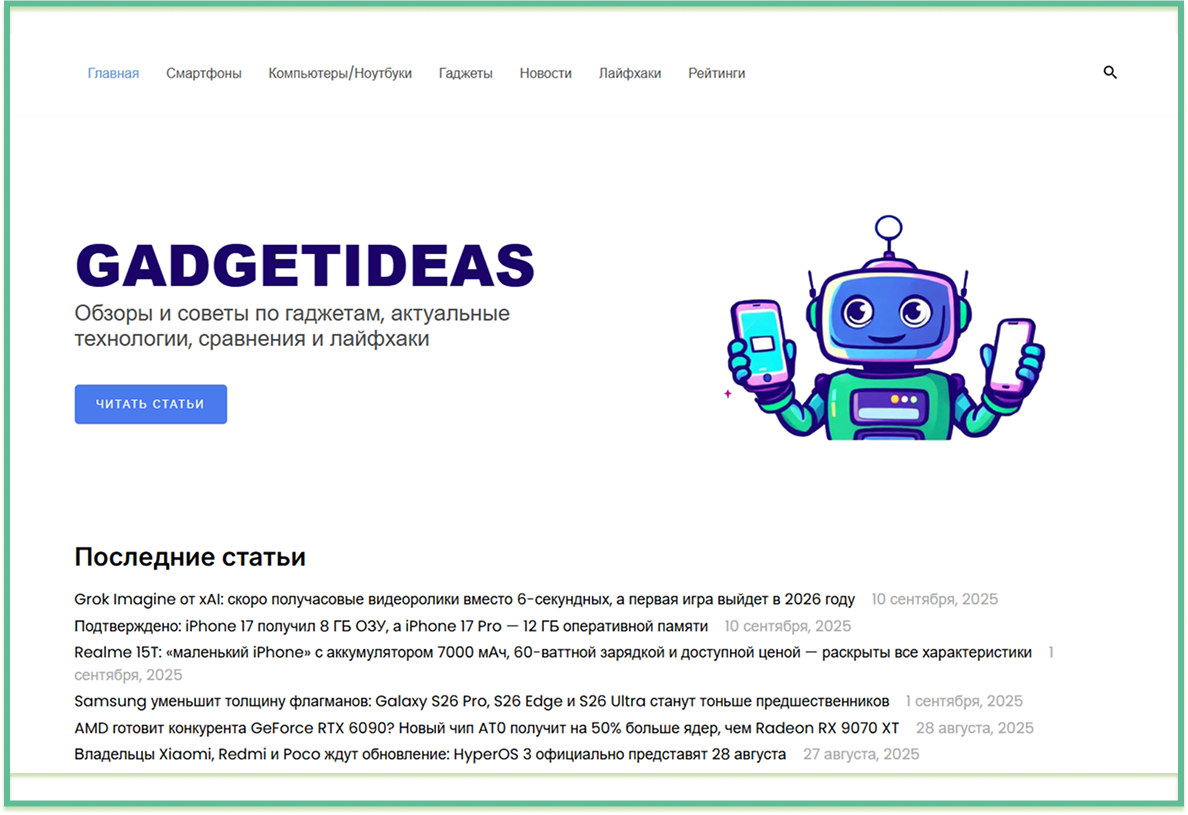 Публикации распределяются по категориям: «Обзоры гаджетов», «Новости технологий» и другие